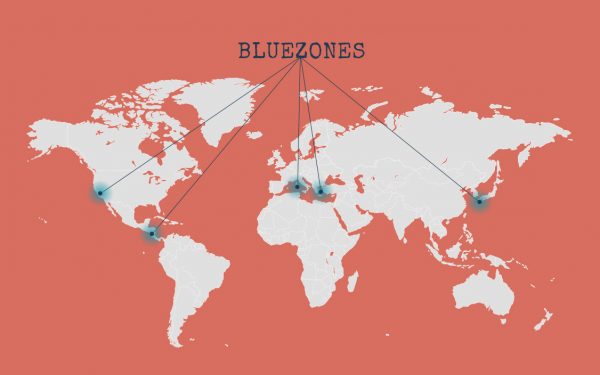Die Blue Zones zijn een aantal kleine regio’s wereldwijd waar de inwoners aanzienlijk ouder worden dan elders. Het gaat bijvoorbeeld om een deel van het eiland Sardinië, een regio bij Palo Alto in Californië en een eiland bij Japan. Door een gezond en regelmatig leefpatroon, door veel buitenlucht en regelmatige beweging, lijken de inwoners van die gebieden ouder te worden dan elders.